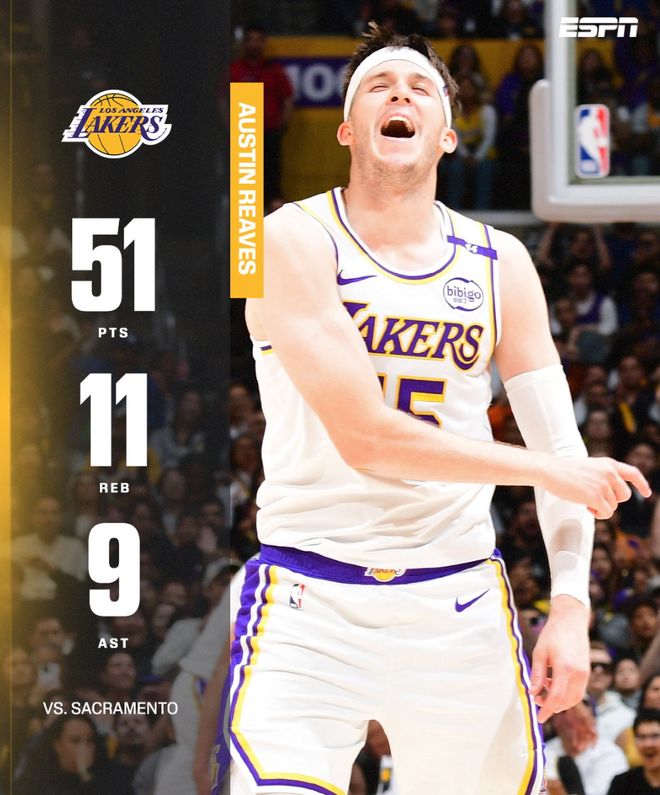 里夫斯前四场得到143分,追平湖人队史单赛季第三高纪录